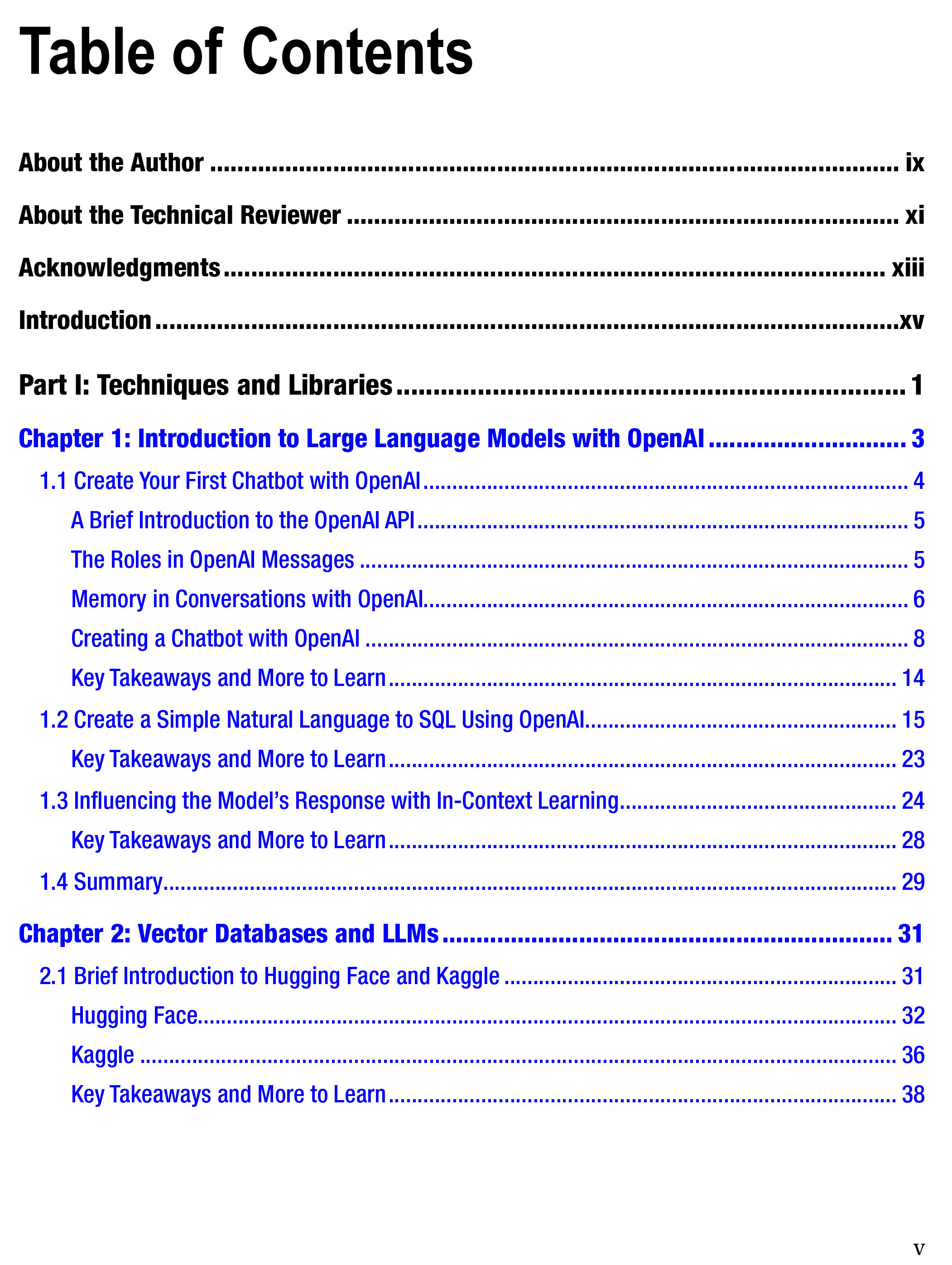The book is divided into three parts. Part one covers techniques and libraries. Here, you'll explore different techniques through small examples, preparing to build projects in the next section. You'll learn to use common libraries in the world of Large Language Models. Topics and technologies covered include chatbots, code generation, OpenAI API, Hugging Face, vector databases, LangChain, fine tuning, PEFT fine tuning, soft prompt tuning, LoRA, QLoRA, evaluating models, and Direct Preference Optimization. Part two focuses on projects. You'll create projects, understanding design decisions. Each project may have more than one possible implementation, as there is often not just one good solution. You'll also explore LLMOps-related topics. Part three delves into enterprise solutions. Large Language Models are not a standalone solution; in large corporate environments, they are one piece of the puzzle. You'll explore how to structure solutions capable of transforming organizations with thousands of employees, highlighting the main role that Large Language Models play in these new solutions.