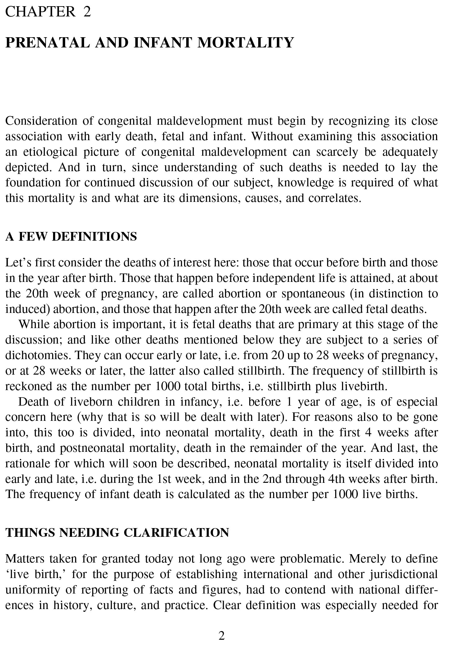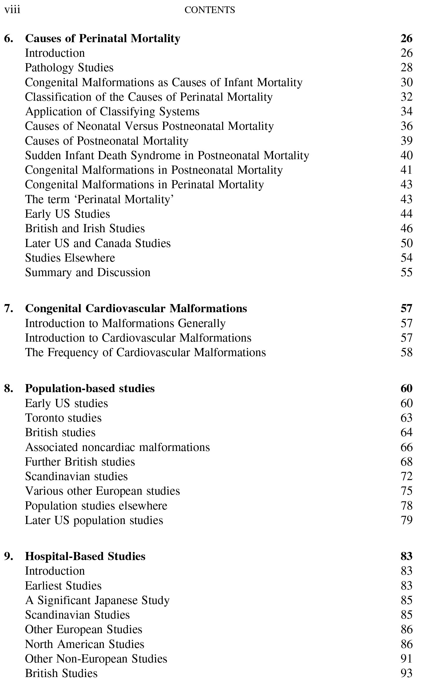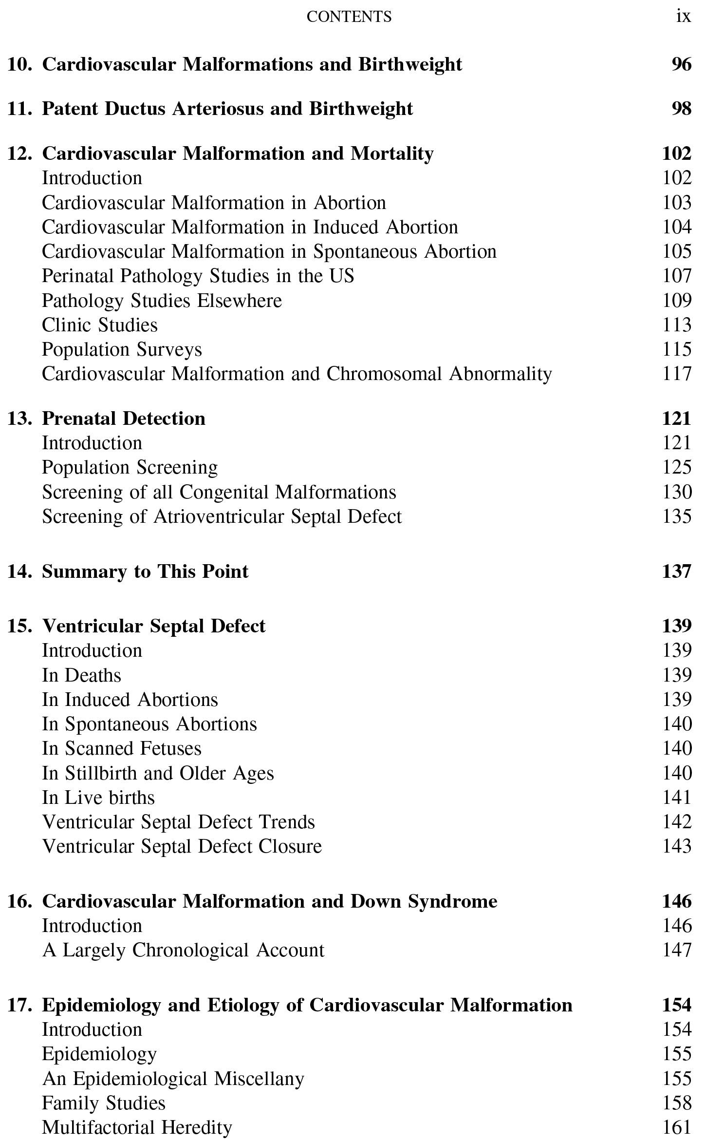 The most frequent of them all are the many types of malformations of the cardiovascular system, the heart and its blood vessels, which happen in about once in every 250 births. Study of these conditions during the twentieth century took many forms, revolving about examination and analysis of their causes, genetic, nongenetic, and complex. To aid in unraveling the complexities of this causation, various influences on their frequency are considered, among them social conditions, maternal health, birthweight, newborn maturity. And of course the known and possible environmental bases of their occurrence are fully described. The relation of infant death to cardiovascular malformation is noted; and puzzlement that the level of such deaths had not kept pace with the reduction of infant death itself and of that associated with other kinds of malformations during this period.