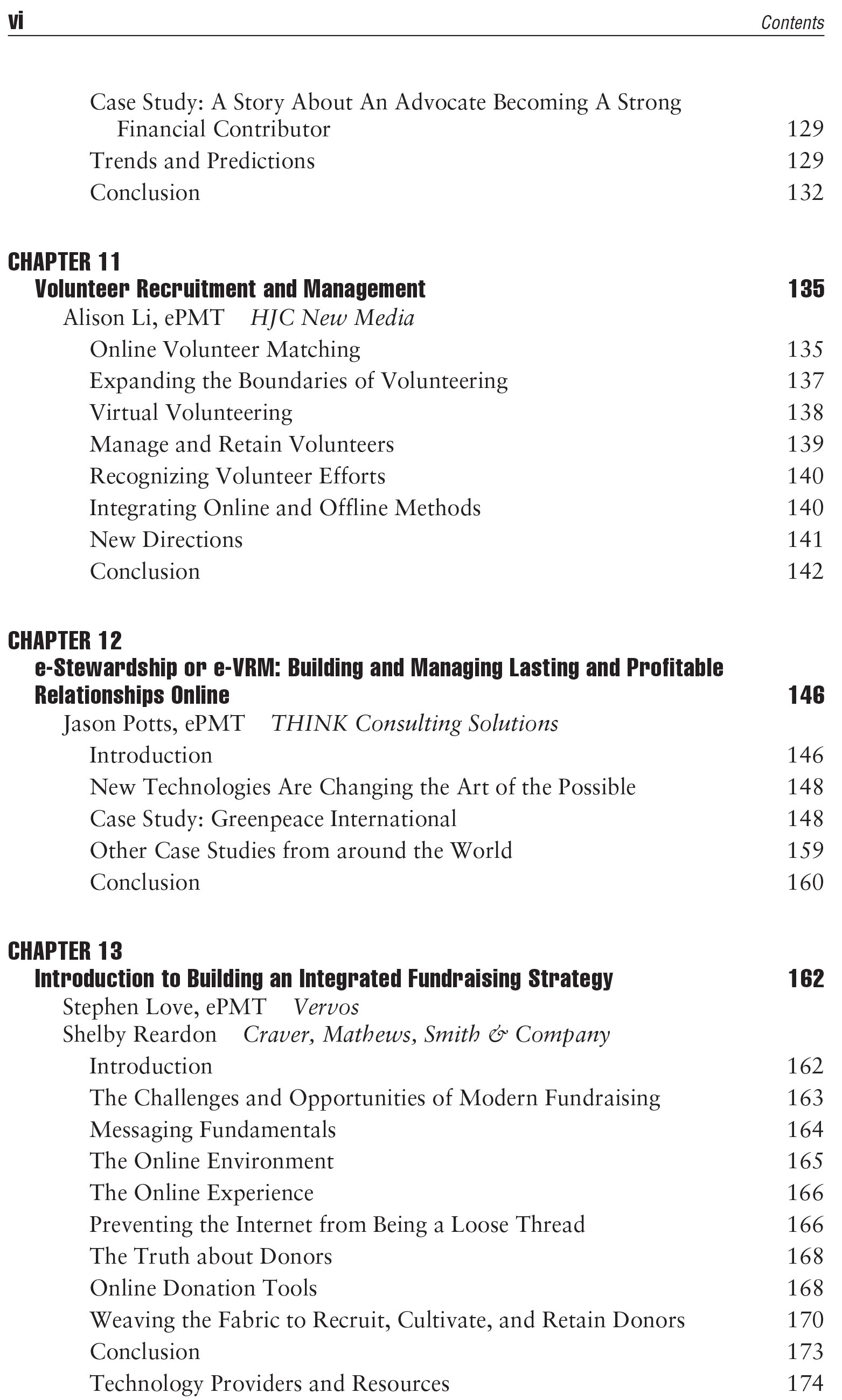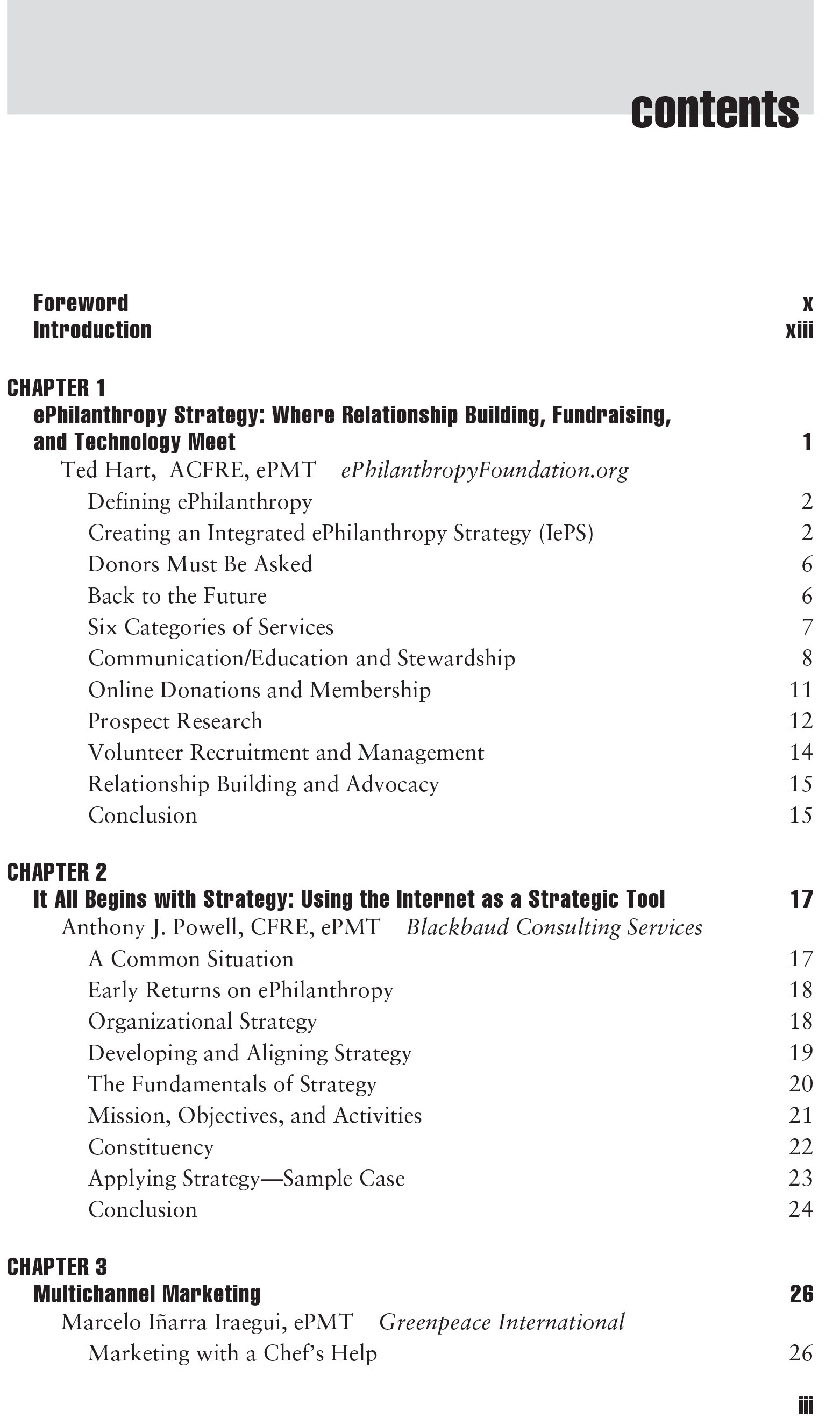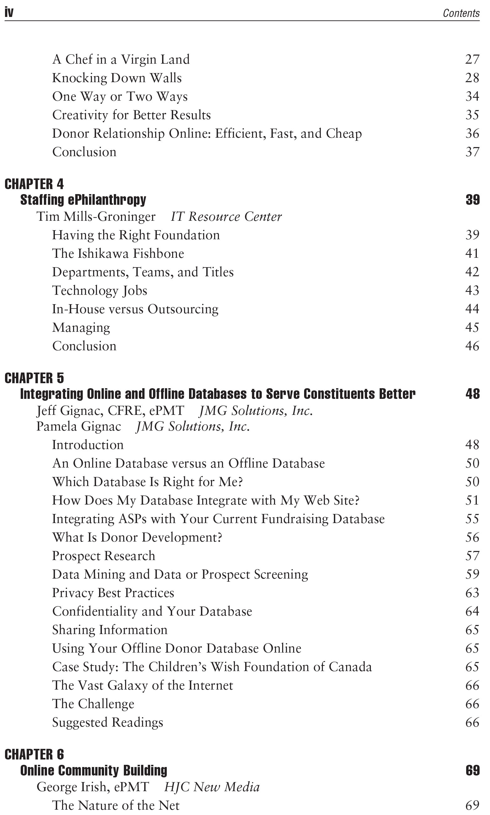 Contributors from nonprofit organizations and from groups advocating electronic philanthropy offer advice to nonprofit fundraisers who want to tap into the Internet. The practice has been around since the middle 1990s, they say, but has only occasionally been successful. The topics include using the Internet as a strategic tool, staffing, online community building, building the brand online, inspiring donors, and planned giving and major gifts