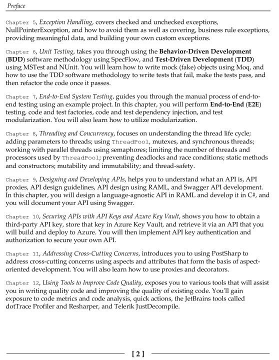 The book starts with a comparison of good and bad code, helping you understand the importance of coding standards, principles, and methodologies. You'll then get to grips with code reviews and their role in improving your code while ensuring that you adhere to industry-recognized coding standards. This C# book covers unit testing, delves into test-driven development, and addresses cross-cutting concerns. You'll explore good programming practices for objects, data structures, exception handling, and other aspects of writing C# computer programs. Once you've studied API design and discovered tools for improving code quality, you'll look at examples of bad code and understand which coding practices you should avoid.