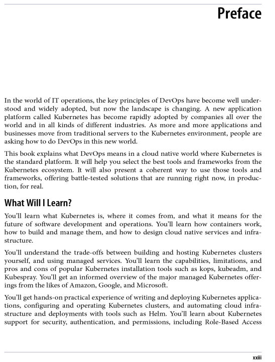 Kubernetes is the operating system of the cloud-native world, providing a reliable and scalable platform for running containerized workloads. This book shows developers and operations staff how to apply industry-standard DevOps practices to Kubernetes in a cloud-native context. You’ll learn all about the Kubernetes ecosystem and discover battle-tested solutions to everyday problems.