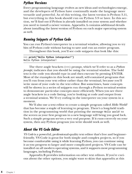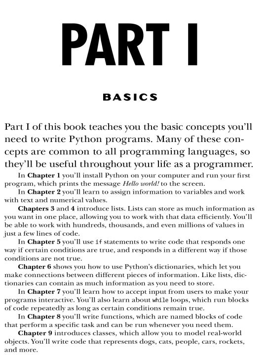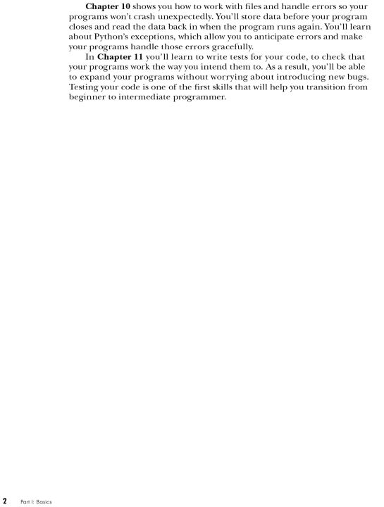 In the first half of the book, youâ??ll learn basic programming concepts, such as variables, lists, loops, and classes, and practice writing clean code with exercises for each topic. Youâ??ll also learn how to make your programs interactive and test your code safely before adding it to a project. In the second half, youâ??ll put your new knowledge into practice with three substantial projects: a Space Invadersâ??inspired arcade game, a set of data visualizations with Pythonâ??s handy libraries, and a simple web app you can deploy online.