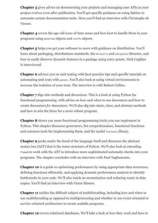 "Offers experienced coders advice and tips for improving knowledge of Python coding language. Includes interviews with Python experts and covers a wide range of common topics, from scaling and testing code to designing APIs"--;Starting your project -- Modules and libraries -- Documentation and good API practice -- Handling timestamps and time zones -- Distributing your software -- Unit testing -- Methods and decorators -- Functional programming -- The abstract syntax tree, Hy, and Lisp-like attributes -- Performances and optimizations -- Scaling and architecture -- Managing regional databases -- Write less, code more.