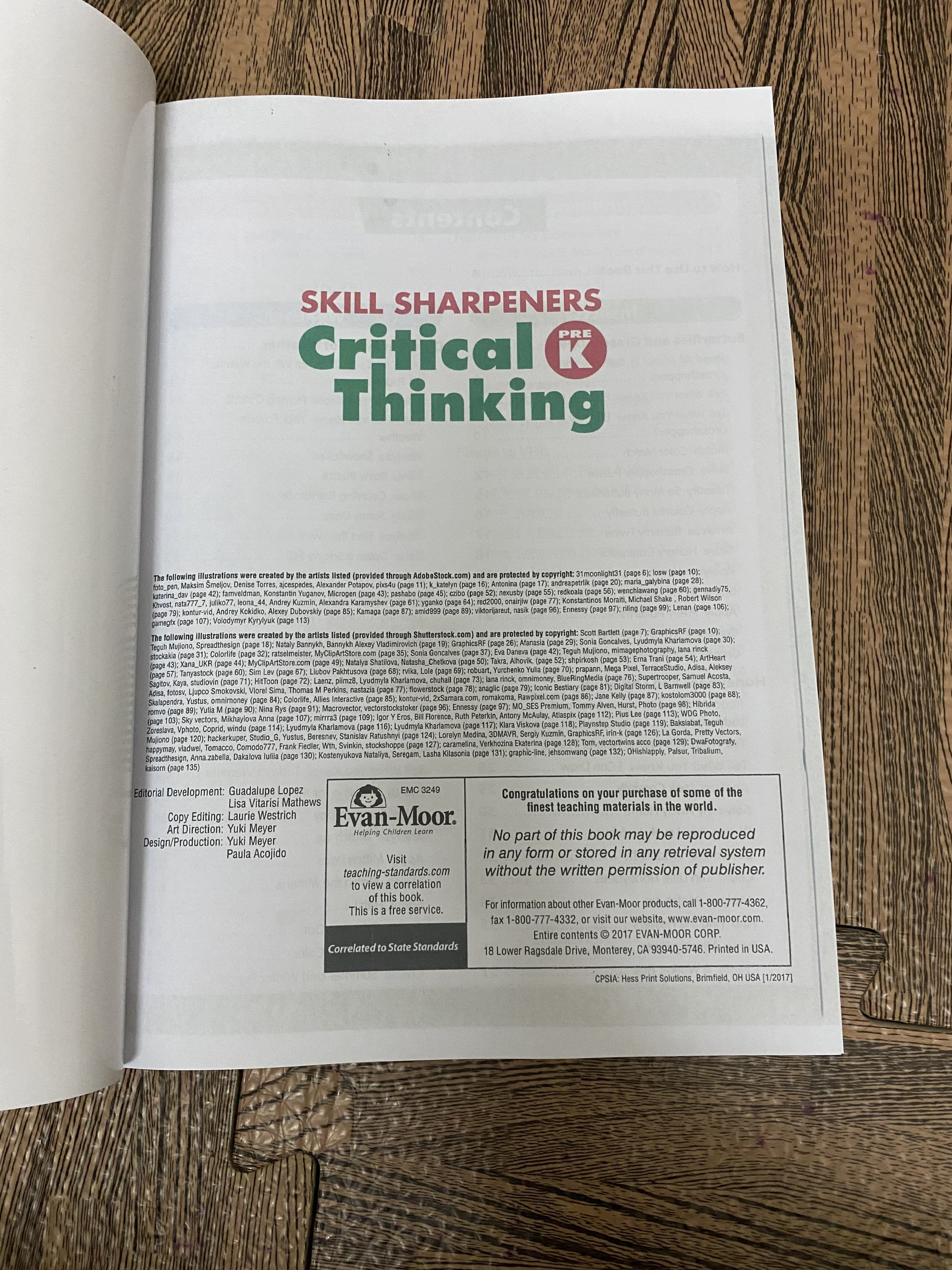 SKILL SHARPENERS CRITICAL THINKING PRE1-K (Sách màu) (Sách gia công, Bìa mềm)