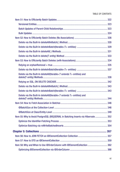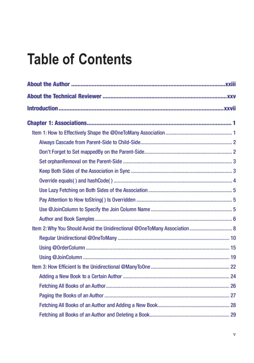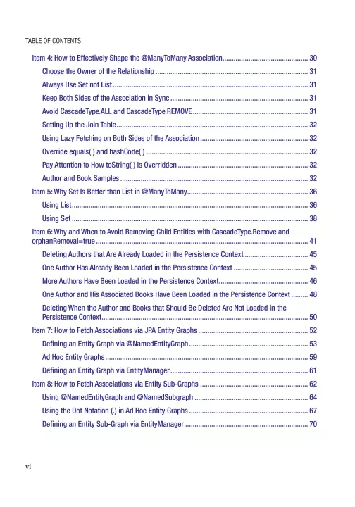 This book is a collection of developer code recipes and best practices for persisting data using Spring, particularly Spring Boot. The book is structured around practical recipes, where each recipe discusses a performance case or performance-related case, and almost every recipe has one or more applications. Mainly, when we try to accomplish something (e.g., read some data from the database), there are several approaches to do it, and, in order to choose the best way, you have to know the implied trades-off from a performance perspective. You’ll see that in the end, all these penalties slow down the application. Besides presenting the arguments that favor a certain choice, the application is written in Spring Boot style which is quite different than plain Hibernate. Persistence is an important set of techniques and technologies for accessing and using data, and this book demonstrates that data is mobile regardless of specific applications and contexts. In Java development, persistence is a key factor in enterprise, ecommerce, cloud and other transaction-oriented applications. After reading and using this book, you'll have the fundamentals to apply these persistence solutions into your own mission-critical enterprise Java applications that you build using Spring. What You Will Learn Shape *-to-many associations for best performances Effectively exploit Spring Projections (DTO) Learn best practices for batching inserts, updates and deletes Effectively fetch parent and association in a single SELECT Learn how to inspect Persistent Context content Dissect pagination techniques (offset and keyset) Handle queries, locking, schemas, Hibernate types, and more Who This Book Is For Any Spring and Spring Boot developer that wants to squeeze the persistence layer performances.