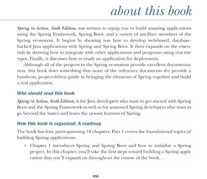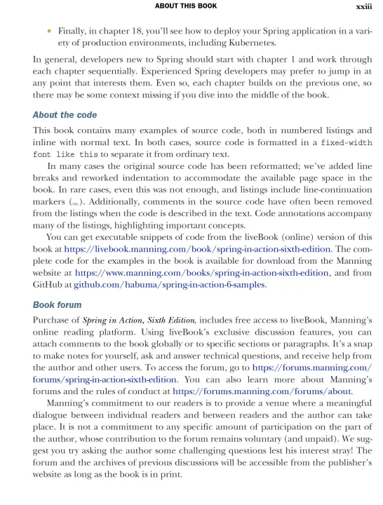 Spring in Action, Sixth Edition is a comprehensive guide to Spring’s core features, all explained in Craig Walls’ famously clear style. You’ll put Spring into action as you build a complete database-backed web app step-by-step. This new edition covers both Spring fundamentals and new features such as reactive flows, Kubernetes integration, and RSocket. Whether you’re new to Spring or leveling up to Spring 5.3, make this classic bestseller your bible!