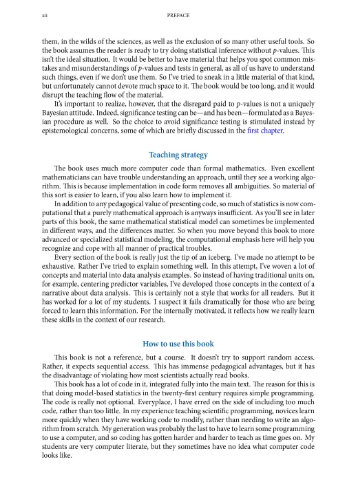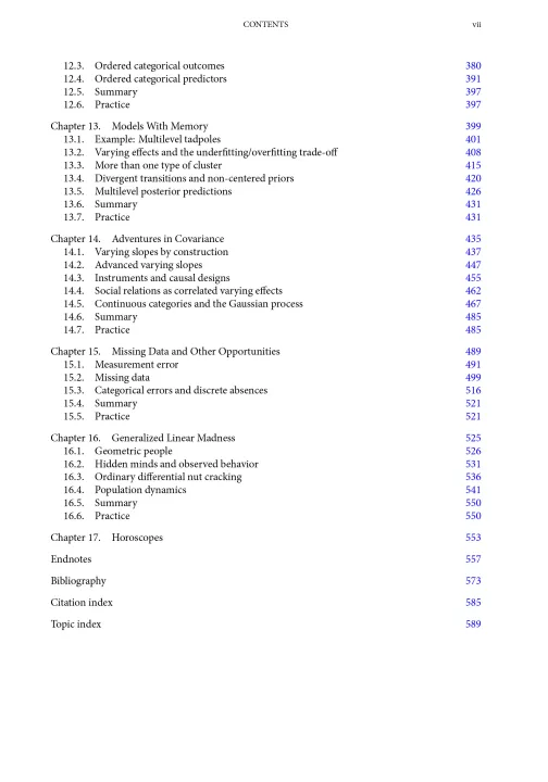 The text presents causal inference and generalized linear multilevel models from a simple Bayesian perspective that builds on information theory and maximum entropy. The core material ranges from the basics of regression to advanced multilevel models. It also presents measurement error, missing data, and Gaussian process models for spatial and phylogenetic confounding.