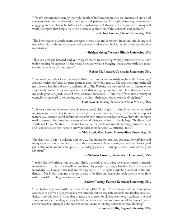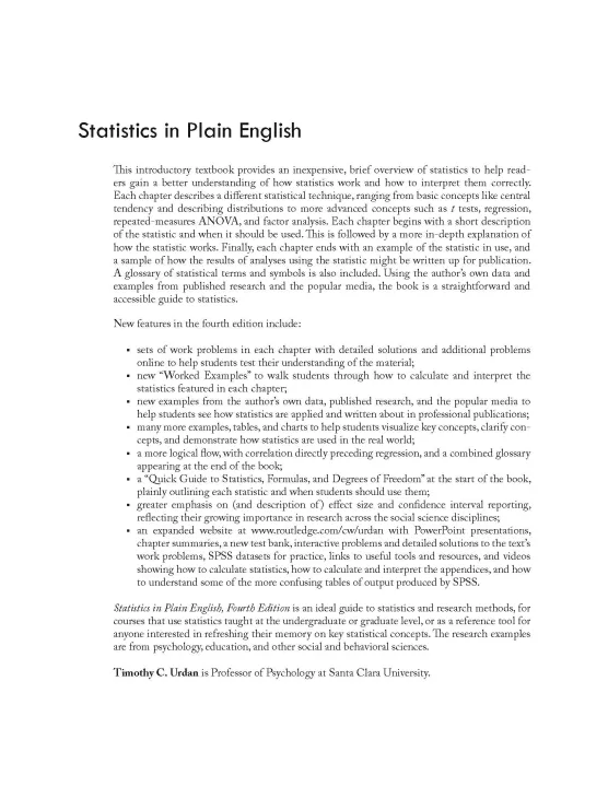 Statistics in Plain English, Fourth Edition" is an ideal guide for statistics, research methods, and/or for courses that use statistics taught at the undergraduate or graduate level, or as a reference tool for anyone interested in refreshing their memory about key statistical concepts. The research examples are from psychology, education, and other social and behavioral sciences. "