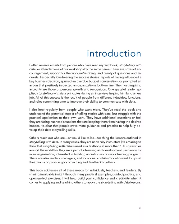 The lessons and exercises found within this comprehensive guide will empower you to master--or develop in others--data storytelling skills and transition your work from acceptable to exceptional. By investing in these skills for ourselves and our teams, we can all tell inspiring and influential data stories!
