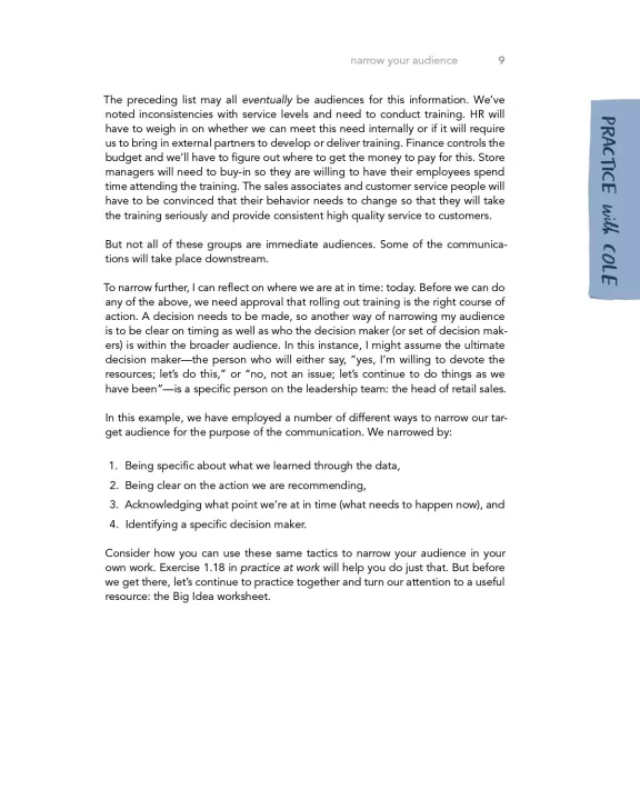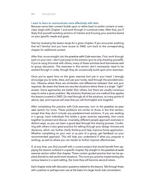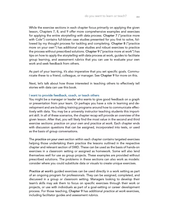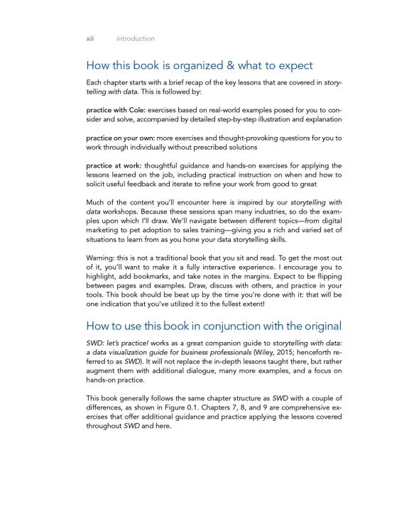 • PRACTICE at WORK: practical guidance and hands-on exercises for applying storytelling with data lessons on the job, including instruction on when and how to solicit useful feedback and refine for greater impact