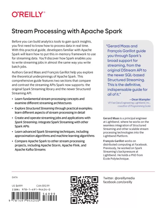 Authors Gerard Maas and François Garillot help you explore the theoretical underpinnings of Apache Spark. This comprehensive guide features two sections that compare and contrast the streaming APIs Spark now supports: the original Spark Streaming library and the newer Structured Streaming API.