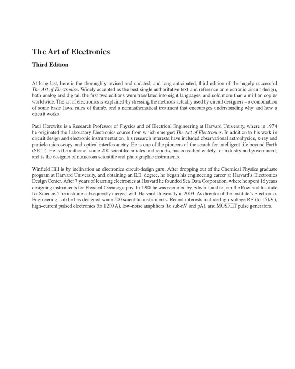 At long last, here is the thoroughly revised and updated third edition of the hugely successful The Art of Electronics. It is widely accepted as the best single authoritative book on electronic circuit design. In addition to new or enhanced coverage of many topics, the third edition includes 90 oscilloscope screenshots illustrating the behavior of working circuits, dozens of graphs giving highly useful measured data of the sort that is often buried or omitted in datasheets but which you need when designing circuits, and 80 tables (listing some 1650 active components), enabling intelligent choice of circuit components by listing essential characteristics (both specified and measured) of available parts. The new Art of Electronics retains the feeling of informality and easy access that helped make the earlier editions so successful and popular. It is an indispensable reference and the gold standard for anyone, student or researcher, professional or amateur, who works with electronic circuits.