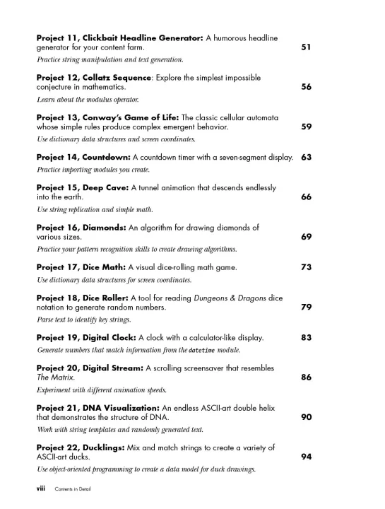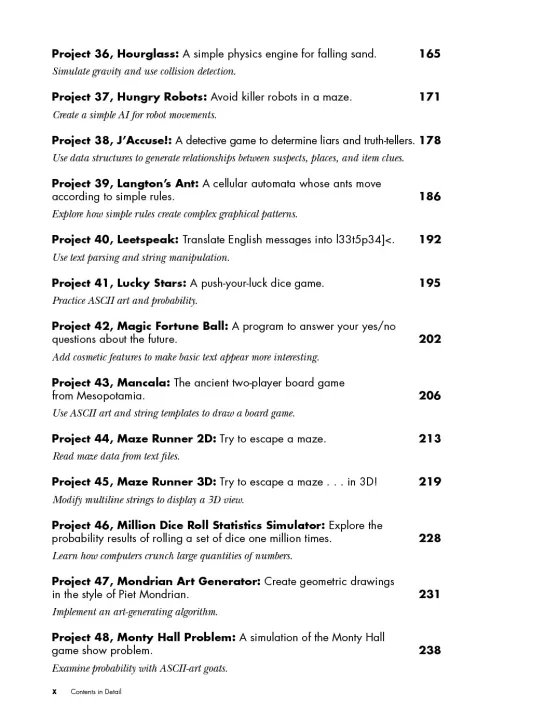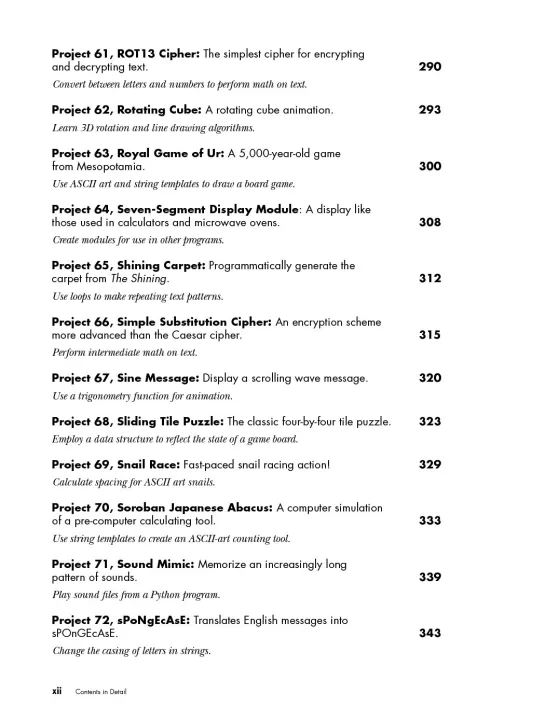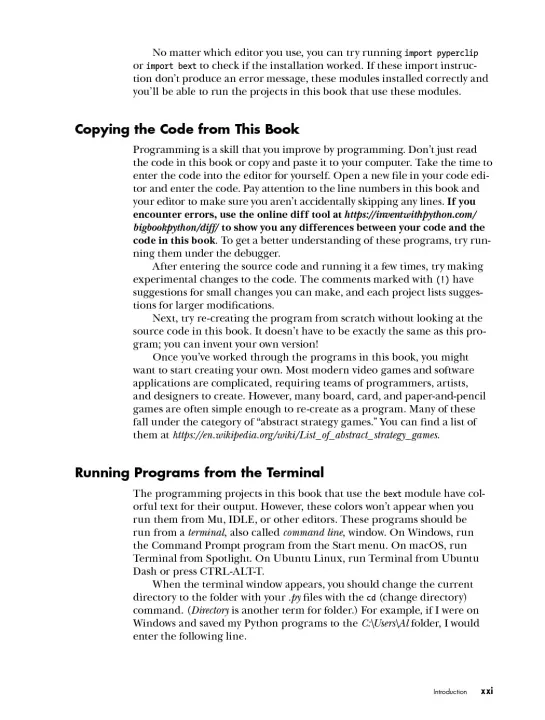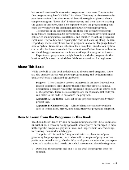 If you’ve mastered basic Python syntax and you’re ready to start writing programs, you’ll find The Big Book of Small Python Projects both enlightening and fun. This collection of 81 Python projects will have you making digital art, games, animations, counting pro- grams, and more right away. Once you see how the code works, you’ll practice re-creating the programs and experiment by adding your own custom touches.