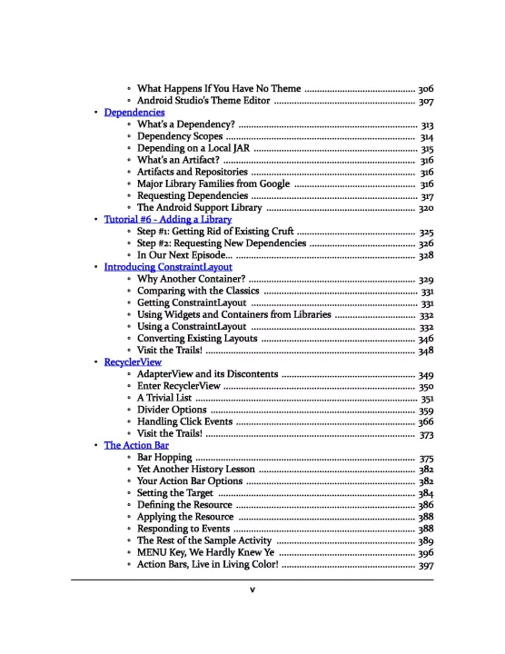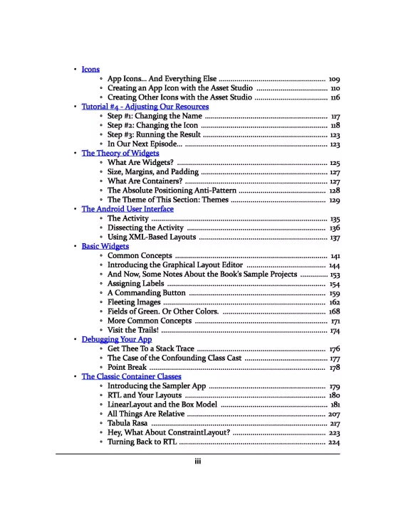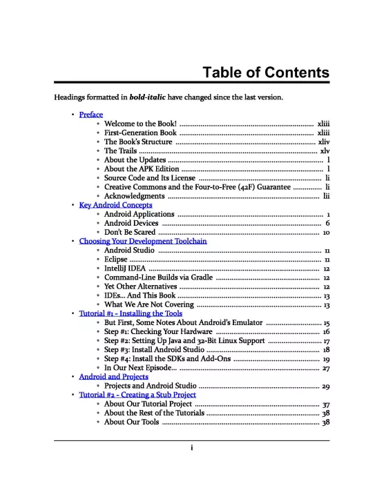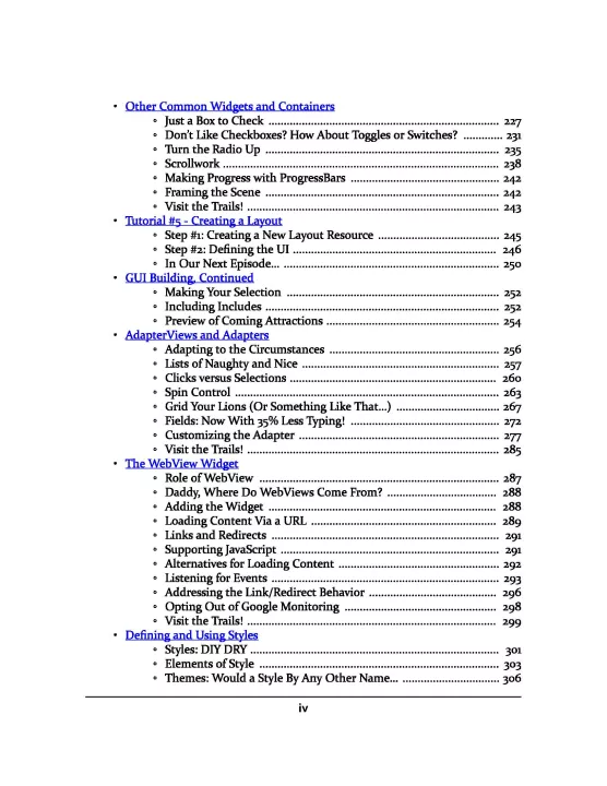 The core chapters — representing ~800 pages — are set up as a typical programming guide, covering the basics of getting an Android app up and running. The book includes material on setting up your development tools, constructing a user interface, loading data from a local database or the Internet, handling the differences between phones and tablets, and much more.