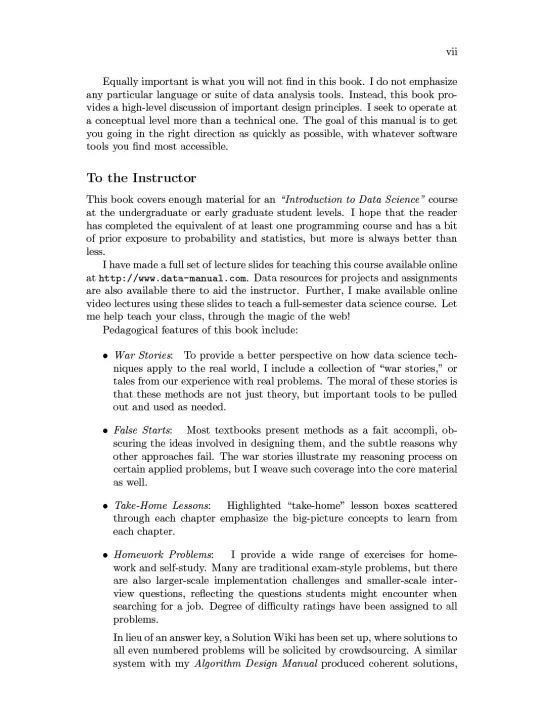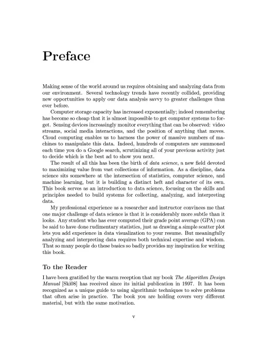 The Data Science Design Manual is a source of practical insights that highlights what really matters in analyzing data, and provides an intuitive understanding of how these core concepts can be used. The book does not emphasize any particular programming language or suite of data-analysis tools, focusing instead on high-level discussion of important design principles.