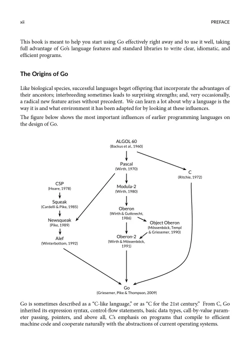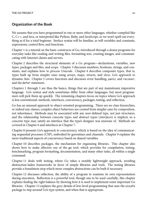 The first chapter is a tutorial on the basic concepts of Go, introduced through programs for file I/O and text processing, simple graphics, and web clients and servers.