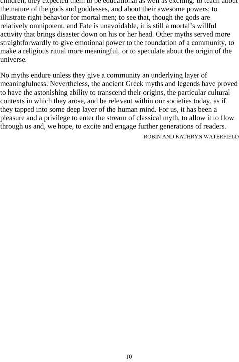 A highly readable and beautifully illustrated re-telling of the most famous stories from Greek mythology. The Greek Myths contains some of the most thrilling, romantic, and unforgettable stories in all human history. From Achilles rampant on the fields of Troy, to the gods at sport on Mount Olympus; from Icarus flying too close to the sun, to the superhuman feats of Heracles, Theseus, and the wily Odysseus, these timeless tales exert an eternal fascination and inspiration that have endured for millennia and influenced cultures from ancient to modern. Beginning at the dawn of human civilization, when the Titan Prometheus stole fire from Zeus and offered mankind hope, the reader is immediately immersed in the majestic, magical, and mythical world of the Greek gods and heroes. As the tales unfold, renowned classicist Robin Waterfield, joined by his wife, writer Kathryn Waterfield, creates a sweeping panorama of the romance, intrigues, heroism, humour, sensuality, and brutality of the Greek myths and legends. The terrible curse that plagued the royal houses of Mycenae and Thebes, Jason and the golden fleece, Perseus and the dread Gorgon, the wooden horse and the sack of Troy'these amazing stories have influenced art and literature from the Iron Age to the present day. And far from being just a treasure trove of amazing tales, The Greek Myths is a catalogue of Greek myth in art through the ages, and a notable work of literature in its own right.