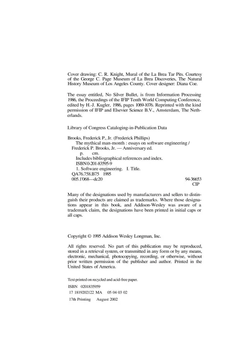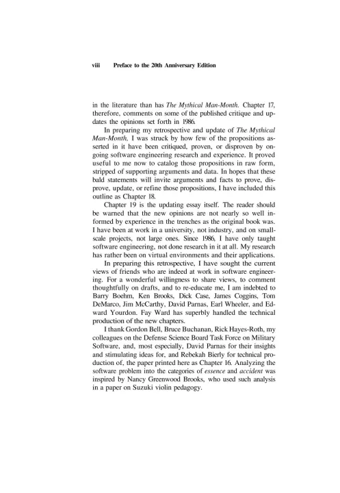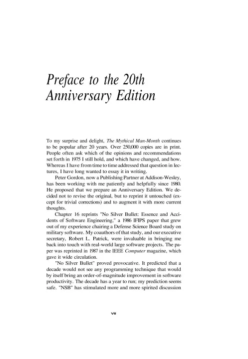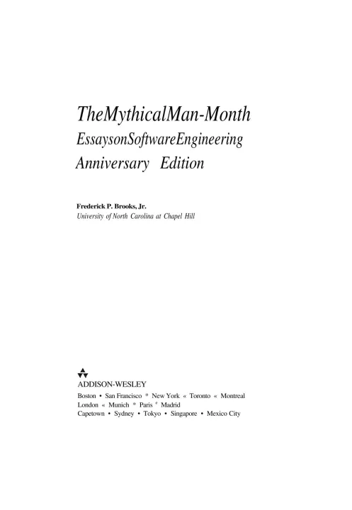 Few books on software project management have been as influential and timeless as The Mythical Man-Month. With a blend of software engineering facts and thought-provoking opinions, Fred Brooks offers insight for anyone managing complex projects. These essays draw from his experience as project manager for the IBM System/360 computer family and then for OS/360, its massive software system. Now, 20 years after the initial publication of his book, Brooks has revisited his original ideas and added new thoughts and advice, both for readers already familiar with his work and for readers discovering it for the first time. The added chapters contain (1) a crisp condensation of all the propositions asserted in the original book, including Brooks' central argument in The Mythical Man-Month: that large programming projects suffer management problems different from small ones due to the division of labor; that the conceptual integrity of the product is therefore critical; and that it is difficult but possible to achieve this unity; (2) Brooks' view of these propositions a generation later; (3) a reprint of his classic 1986 paper "No Silver Bullet"; and (4) today's thoughts on the 1986 assertion, "There will be no silver bullet within ten years