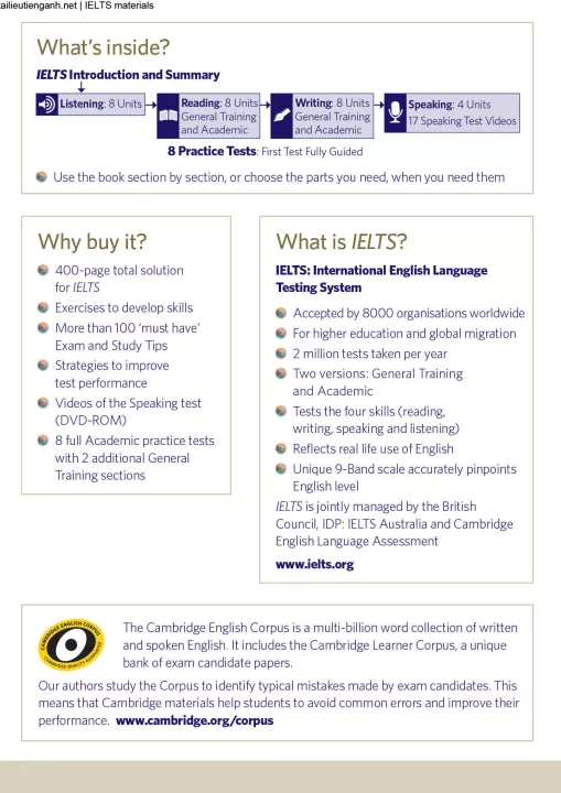 The Official Cambridge Guide to IELTS is THE definitive guide to IELTS. It contains all you need to succeed in the exam. Skill-building exercises cover all of the question types in the exam for both the General Training and Academic Modules. Our research into real IELTS candidates' exam answers - and the mistakes they make, helps you avoid the same ones! Eight official practice tests and a focus on test-taking strategy help you maximise your score. Videos of the Speaking test, and all the listening material, including the tests, can be found on the DVD-ROM or downloaded via an accompanying App from iTunes or Google Play. IELTS is jointly managed by the British Council, IDP: IELTS Australia and Cambridge English Language Assessment.