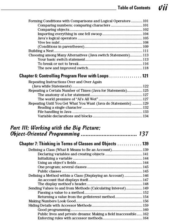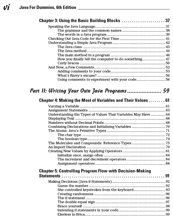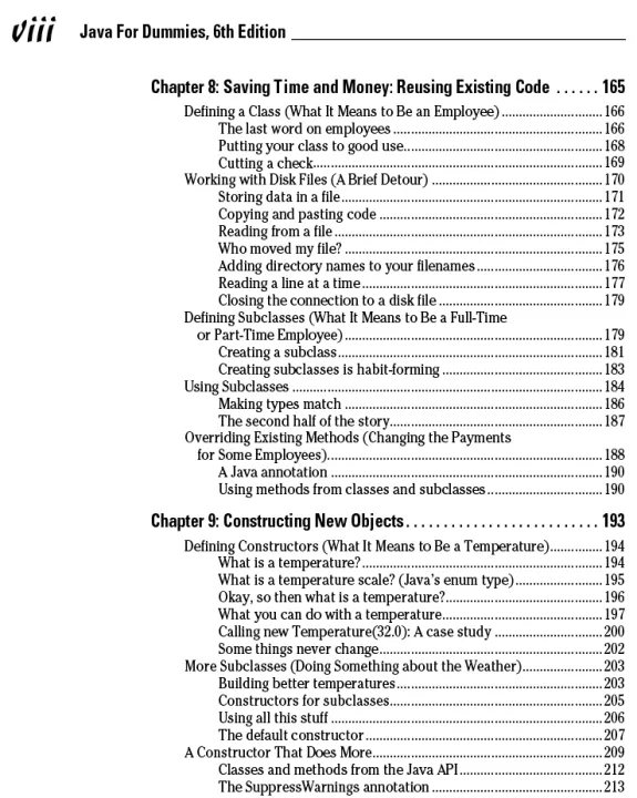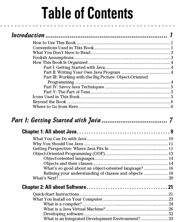 Cuốn sách bao gồm mười chín chương, chương đầu tiên cung cấp cho người đọc lời khuyên chuyên nghiệp về cách tận dụng tối đa thời gian họ dành cho việc đọc cuốn sách, trong khi chương cuối cùng cung cấp cho người đọc danh sách mười trang web tốt nhất dành cho các lập trình viên Java. Đồng thời, người đọc sẽ làm quen với các tính năng và công cụ nâng cao được giới thiệu trong Java 9, có được kiến thức về các phương pháp và chiến lược để tích hợp các ứng dụng nhỏ hơn vào các ứng dụng lớn hơn và có được sự hiểu biết thấu đáo về các đối tượng Java và tái sử dụng mã. Người đọc sẽ có thể thoải mái vượt qua bất kỳ khó khăn lập trình nào sau khi đọc cuốn sách này vì nó cũng cung cấp hướng dẫn hữu ích về cách dễ dàng quản lý các sự kiện và ngoại lệ. Nhìn chung, Java for Dummies là cuốn sách nên đọc cho tất cả những ai muốn trở thành chuyên gia lập trình Java và đẩy khả năng của mình lên một tầm cao mới.
