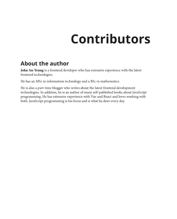 This book is for web developers who want to learn frontend web development with Vue 3 and use it to create professional applications. You'll also find this book useful if you're looking to create full-stack web apps with Vue.js 3.0 as the frontend. Knowledge of JavaScript programming is required to get the most out of this book.