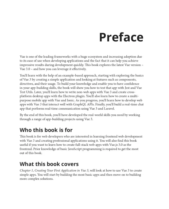 The book takes an example-based approach to help you get to grips with the basics of Vue 3 and create a simple application by exploring features such as components and directives. You'll then enhance your app building skills by learning how to test the app with Jest and Vue Test Utils. As you advance, you'll understand how to write non-web apps with Vue 3, create cross-platform desktop apps with the Electron plugin, and build a multi-purpose mobile app with Vue and Ionic. You'll also be able to develop web apps with Vue 3 that interact well with GraphQL APIs. Finally, you'll build a chat app that performs real-time communication using Vue 3 and Laravel.