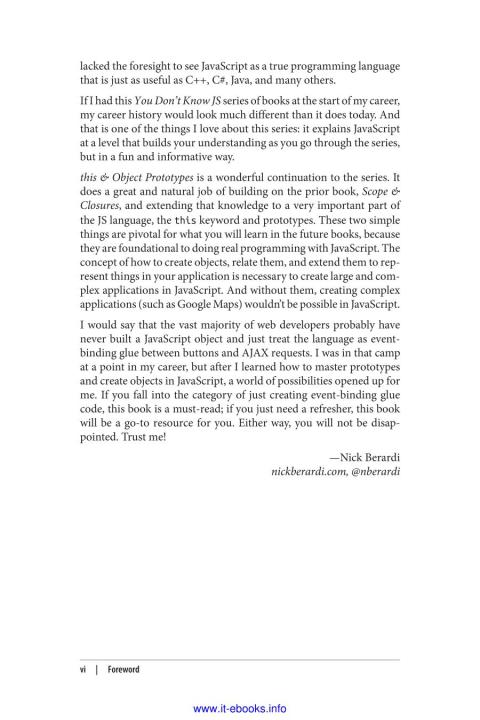 Like other books in the “You Don’t Know JS” series, this and Object Prototypes dives into trickier parts of the language that many javascript programmers simply avoid. Armed with this knowledge, you can become a true javascript master.