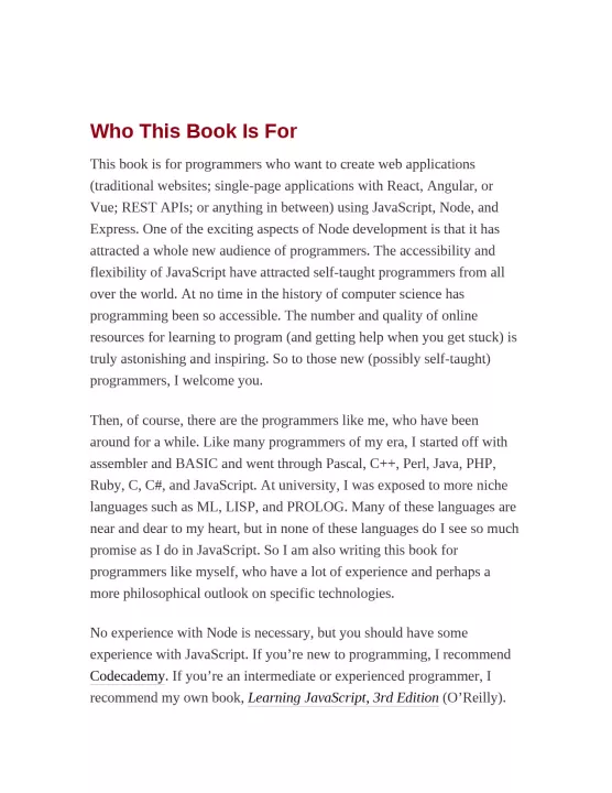 Express strikes a balance between a robust framework and no framework at all, allowing you a free hand in your architecture choices. Frontend and backend engineers familiar with JavaScript will also learn best practices for building multipage and hybrid web apps with Express. Pick up this book anddiscover new ways to look at web development.
